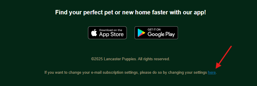 If you want to stop receiving email notifications from Lancaster Puppies, you can turn them off by clicking on Unsubscribe from any email you no longer wish to receive.